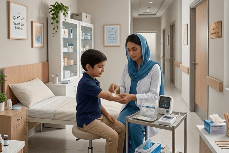 A cosy space dedicated to rest and recovery, equipped with basic medical necessities.